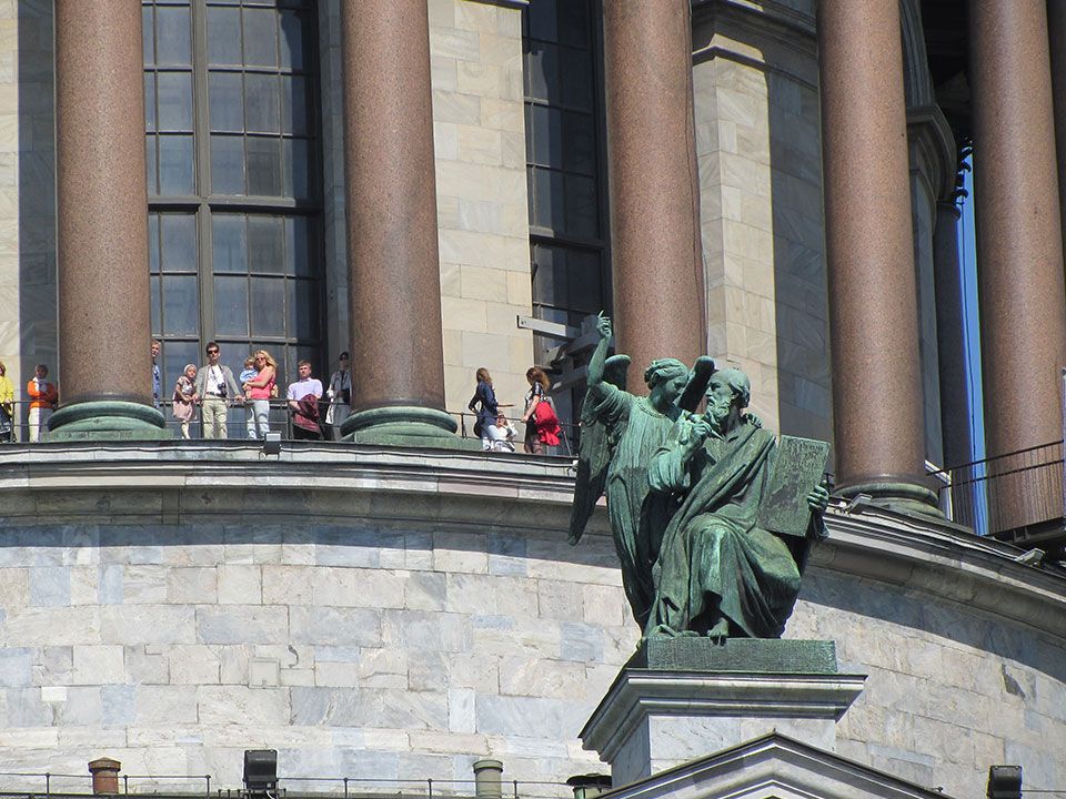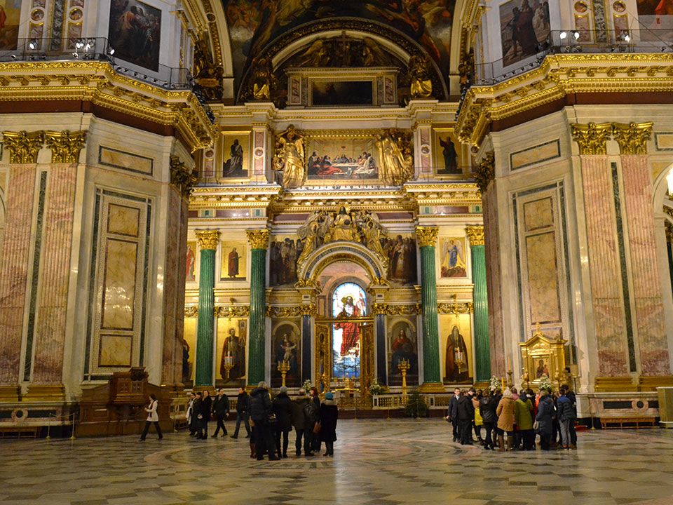 la Cattedrale di Sant'Isacco uno dei monumenti più interessanti dell'arte russa e dell'architettura neoclassica del XIX secolo con una cupola tra le più grandi al mondo. Fu disegnata dall'architetto francese August Montferrand e fu costruita dal 1818 al 1858. Pietro I il Grande (1682-1725), il fondatore di San Pietroburgo, nacque il 30 maggio /9 giugno/ del 1672 ovvero nel giorno dedicato a sant'Isacco, monaco che visse a Bisanzio nel IV secolo, perciò nella città ci fu sempre una chiesa consacrata a questo santo. La cattedrale attuale è già la quarta.
