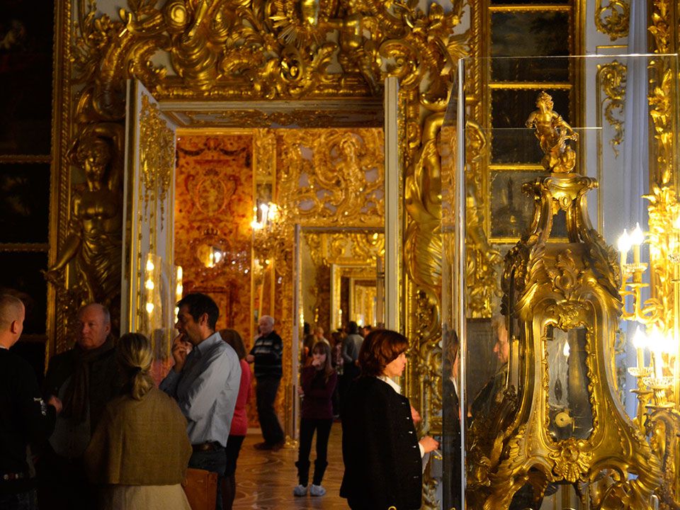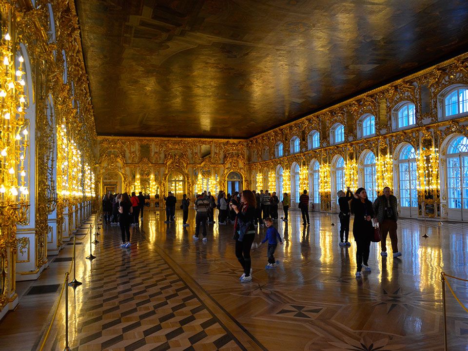 Tsarskoe selo (Pushkin) è una residenza degli zar russi, che si trova a circa 29km. da San Pietroburgo che fu fondata da Pietro I negli anni 1710-1720 e fino alla rivoluzione del 1917 fu una delle residenze estive della famiglia Romanov. Il nome del Palazzo e del parco ricorda Caterina I, la prima padrona di questa residenza, ma il palazzo di Caterina attuale risale ai tempi di Elisabetta e fu ricostruito (1752-1756) nello stile barocco per il progetto di Rastrelli. L’interno più famoso del palazzo è il Studio d’Ambra (Sala d’Ambra)-1755 Rastrelli, chiamato cosi per decorato con i pannelli d’ambra.